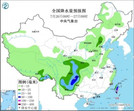 圖4 全國降水量預(yù)報圖(7月26日08時-27日08時)