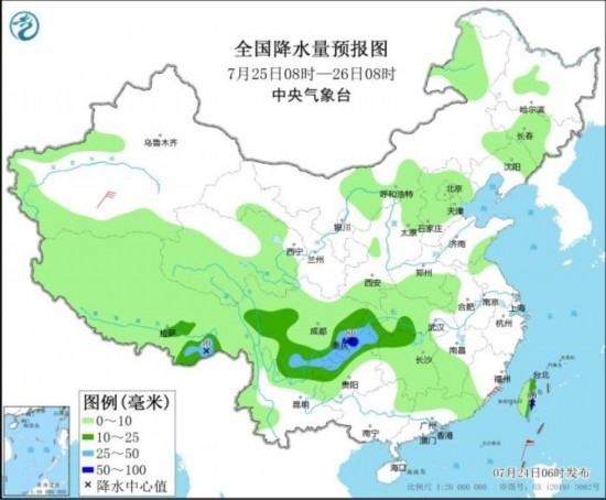 預(yù)計,7月24日08時至25日08時,四川盆地中南部、重慶大部、貴州北部、云南東北部、湖北西南部、湖南西北部以及浙江南部、福建中北部、江西南部、黑龍江北部、西藏東部等地部分地區(qū)有大到暴雨,其中,重慶南部等地局部地區(qū)有大暴雨(100~140毫米)。上述部分地區(qū)伴有短時強降水(最大小時降雨量30~50毫米,局地可超過70毫米),局地有雷暴大風(fēng)等強對流天氣。中央氣象臺7月24日06時繼續(xù)發(fā)布暴雨藍(lán)色預(yù)警。
