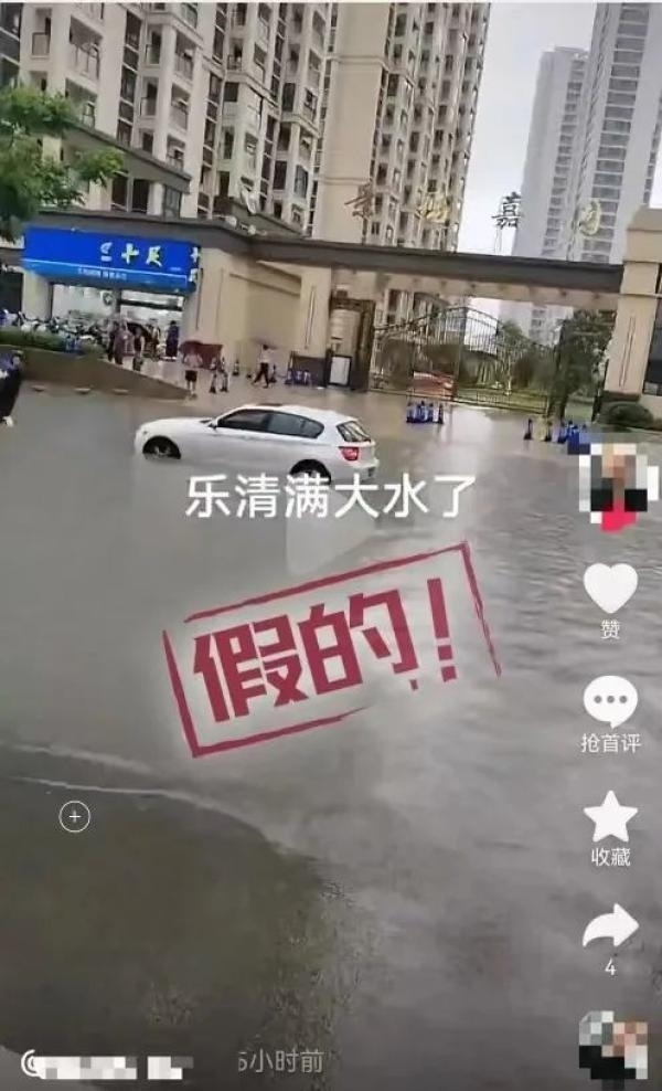 巡查還發(fā)現(xiàn)有網(wǎng)民發(fā)布視頻,標(biāo)有文字“樂清滿大水了”,內(nèi)容可見有小區(qū)門口積水嚴(yán)重,在道路停放的幾輛汽車被淹至車身一半。經(jīng)核實(shí),該視頻并非發(fā)生在樂清。發(fā)布視頻的網(wǎng)民陳某某(男,43歲)為吸引眼球捏造事實(shí),在某平臺(tái)賬號(hào)發(fā)布,造成負(fù)面影響,已被警方依法給予行政處罰。