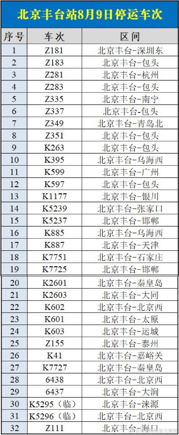 8月9日北京西站、北京豐臺(tái)站部分列車停運(yùn)