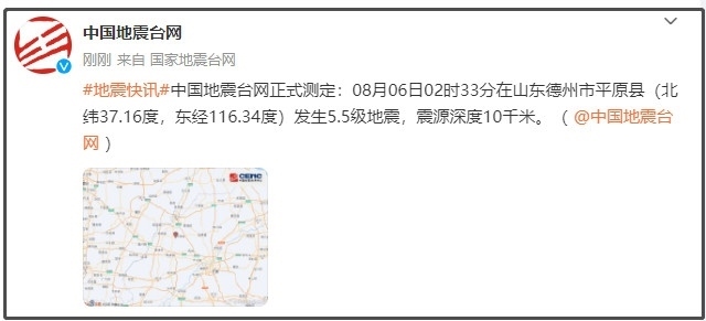 ·山東德州市平原縣發(fā)生5.5級地震,震源深度10公里,河南、河北等地震感強烈。已發(fā)生余震52次,有10人受傷,濟南啟動三級應(yīng)急響應(yīng)。