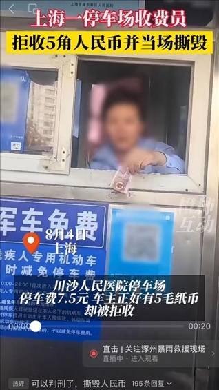 ·上海一醫(yī)院停車場收費人員拒收5角紙幣并撕毀,被行政處罰。