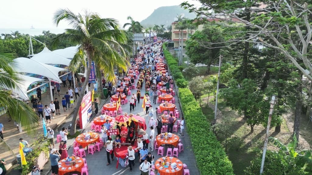 上千桌宴席沿街?jǐn)[開,來(lái)自五湖四海的游客和當(dāng)?shù)貪O民們歡聚一堂,沐浴著星光與海風(fēng),從五柳紅古魚,到海膽海鮮飯,一道道漁家美食端上餐桌,讓食客品嘗舌尖美味,感受來(lái)自海陵島的獨(dú)特風(fēng)味。