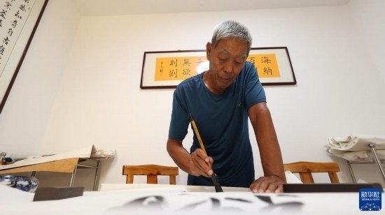 8月22日,老人在青縣曹寺鎮(zhèn)曹寺村的孝老食堂練習書法。