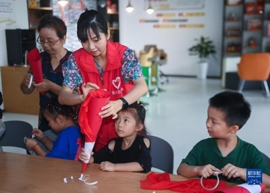 8月24日,在湖州市龍泉街道白魚潭社區(qū)新時(shí)代文明實(shí)踐站,黨員志愿者教孩子們制作手工火炬。