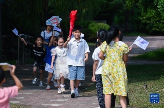 8月24日,在湖州市龍泉街道白魚潭社區(qū),孩子們拿著自己制作的火炬,參與趣味火炬?zhèn)鬟f活動(dòng)。