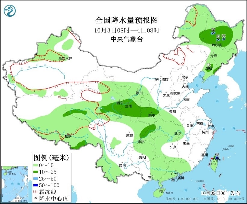 10月3日08時至4日08時,黑龍江西南部、遼寧東部、西藏東南部、青海東部、甘肅東南部、陜西中南部、重慶北部以及臺灣島北部等地部分地區(qū)有中到大雨,其中,臺灣島北部和東部等地部分地區(qū)有暴雨(50~95毫米)。內(nèi)蒙古東南部、西藏北部等地部分地區(qū)有4~6級風。渤海、渤海海峽、黃海大部、東海北部將有6~7級風、陣風8級,東海西南部海域風力將有7~8級風、陣風9級。臺灣以東洋面將有7~8級轉(zhuǎn)9~10級風、陣風9級轉(zhuǎn)11級(見圖2)。