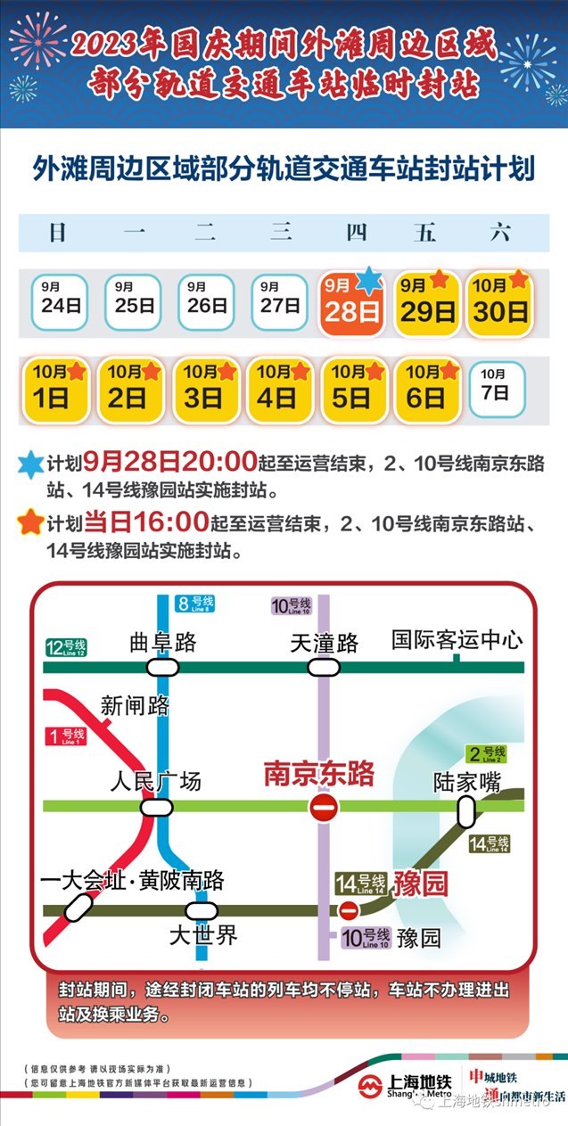 此外,9月28日20:00至運(yùn)營結(jié)束,以及9月29日至10月6日的每日16:00至運(yùn)營結(jié)束,地鐵2、10號線南京東路站,14號線豫園站計劃實施封站跳停。