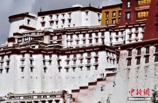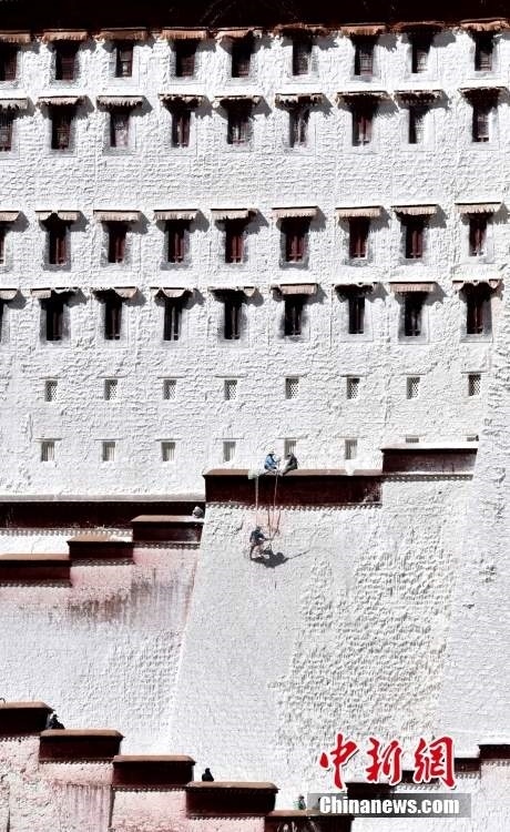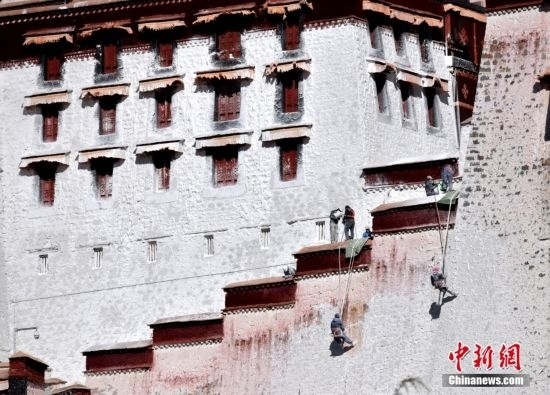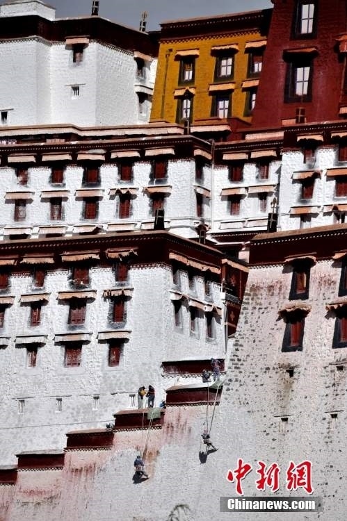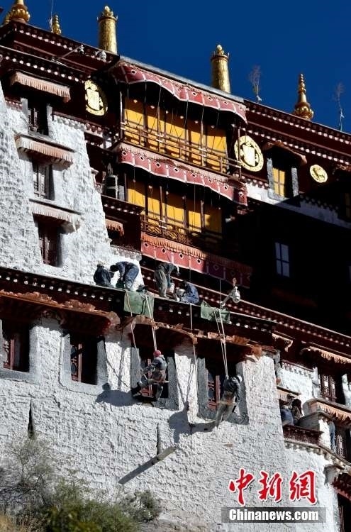10月19日,西藏拉薩,工作人員對布達(dá)拉宮外墻噴灑涂料。每年秋冬交替時(shí)節(jié),布達(dá)拉宮外墻都要進(jìn)行粉刷“美顏”。按照慣例,每季粉刷將在藏歷9月22日“神降節(jié)”前完成。