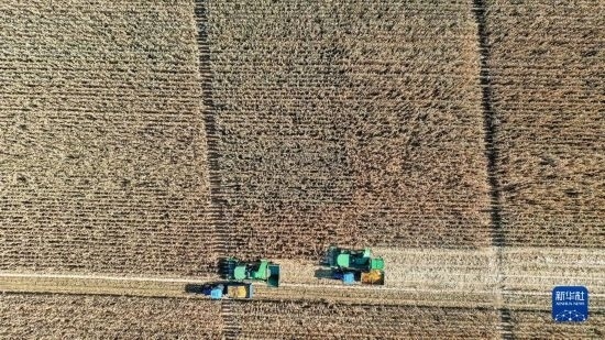 10月19日,在中國科學(xué)院“黑土糧倉”科技會戰(zhàn)長春示范區(qū)公主嶺示范基地,無人駕駛農(nóng)機(jī)在收獲玉米。