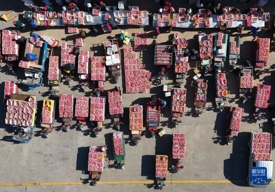 10月20日,果農(nóng)在延安市洛川縣一家果業(yè)企業(yè)售賣(mài)蘋(píng)果(無(wú)人機(jī)照片)。
