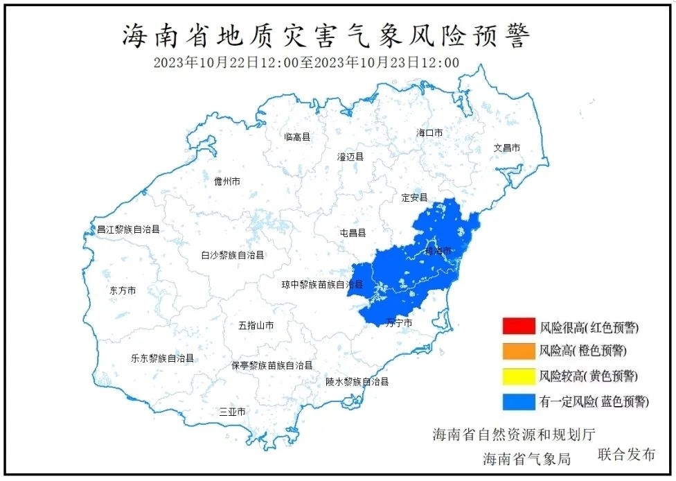 海南省自然資源和規(guī)劃廳、海南省氣象局2023年10月22日10時聯(lián)合發(fā)布地質(zhì)災(zāi)害氣象風(fēng)險預(yù)警:根據(jù)海南省氣象臺前期降雨實況和未來24小時降雨預(yù)報,預(yù)計未來24小時(2023年10月22日12:00-10月23日12:00)瓊海市全境,萬寧市龍滾鎮(zhèn)、三更羅鎮(zhèn)、北大鎮(zhèn),瓊中縣中平鎮(zhèn)降雨誘發(fā)地質(zhì)災(zāi)害有一定風(fēng)險,為Ⅳ級風(fēng)險預(yù)警(藍(lán)色預(yù)警)。請上述市縣、鄉(xiāng)鎮(zhèn)政府及有關(guān)部門做好地質(zhì)災(zāi)害防御工作。