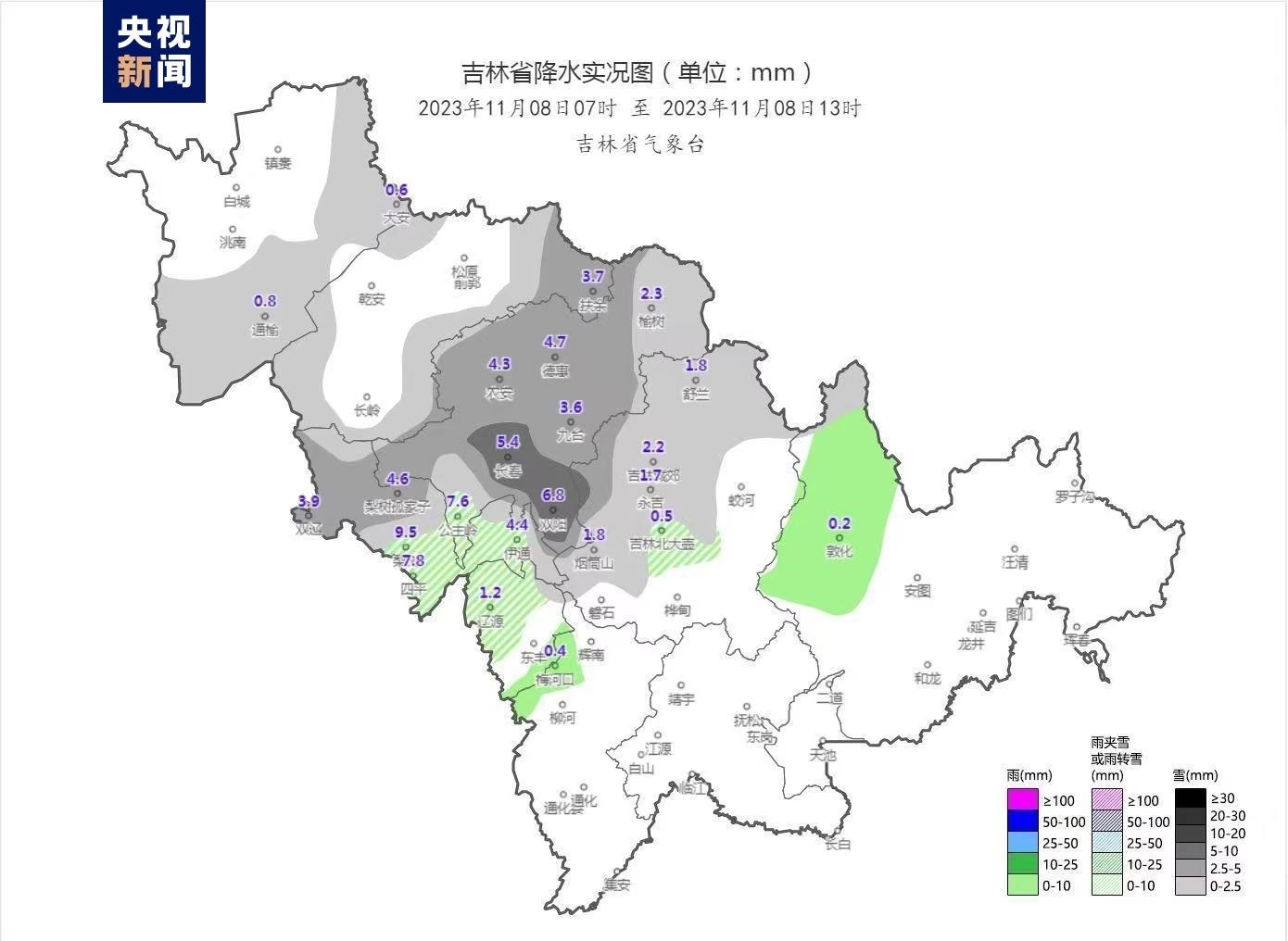 受低空冷切變影響,11月8日早晨開始,吉林省大部出現(xiàn)明顯雨雪天氣,并伴有相態(tài)轉(zhuǎn)換。當(dāng)前,吉林省大部分地區(qū)出現(xiàn)了積雪,最大積雪深度出現(xiàn)在榆樹市,積雪深度為30厘米。