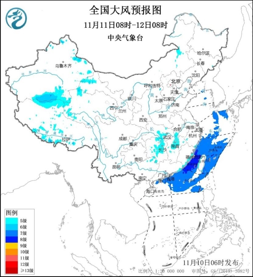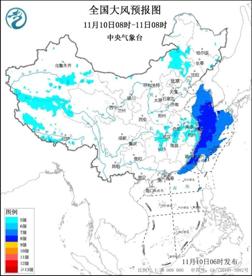 11月10日08時至11日08時,內(nèi)蒙古中東部、遼寧西部、安徽中南部、河南南部、江蘇南部、上海、湖北南部、湖南東北部、江西北部、浙江北部及東部沿海、福建沿海、臺灣島沿海等地有5~6級、陣風7~8級的大風;黃海大部海域、東海大部海域、臺灣海峽、臺灣以東洋面偏北海域、南海東北部偏北海域?qū)⒂?~8級、陣風9~10級的大風。11月11日08時至12日08時,安徽南部、湖北中東部、湖南大部、江西中北部、廣西東北部以及福建沿海、廣東東部沿海、臺灣島沿海等地有5~6級、陣風7~8級的大風;東海大部海域、臺灣海峽、臺灣以東洋面、南海北部海域、巴士海峽偏北海域?qū)⒂?~8級、陣風9~10級的大風。中央氣象臺11月10日06時繼續(xù)發(fā)布大風藍色預警(見圖2、3)。