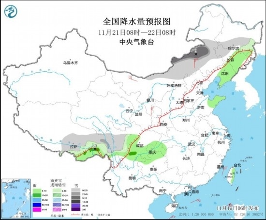 11月21日08時至22日08時,內(nèi)蒙古中部、黑龍江南部、吉林西部、西藏東南部、川西高原等地部分地區(qū)有小雪或雨夾雪,其中,內(nèi)蒙古中東部、西藏東部等地部分地區(qū)有中到大雪(5~9毫米)。吉林東部、遼寧中東部、山東半島、西藏東南部、四川南部、重慶南部、貴州西北部等地部分地區(qū)有小到中雨,其中,西藏東南部等地部分地區(qū)有大雨(25~30毫米)。內(nèi)蒙古西部和中部、寧夏等地部分地區(qū)有4~6級風(見圖4)。