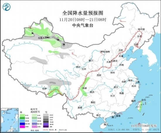 11月19日08時至20日08時,新疆北部和伊犁河谷、黑龍江東部、吉林東部等地部分地區(qū)有小雪或雨夾雪,其中,新疆北部部分地區(qū)有中到大雪,局地暴雪(10~12毫米)。新疆北部、西藏東南部、四川南部、云南西部等地部分地區(qū)有小雨。內(nèi)蒙古中部和東部、黑龍江東部、遼寧東部等地部分地區(qū)有4~5級風(見圖2)。