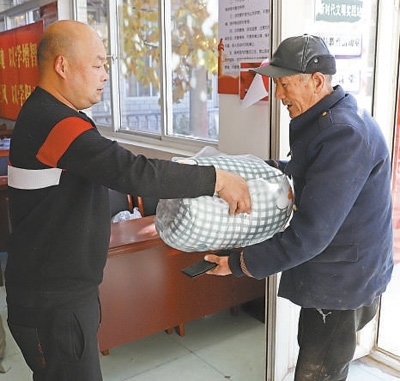 上午10時,走進碼頭村黨群服務(wù)中心,正碰上73歲老人杜金亭騎著電動三輪車,載著老伴來領(lǐng)新棉被。為保障困難群眾冬季取暖,涿州市民政局為全市殘疾人、“六類人群”免費發(fā)放過冬棉被。杜金亭的老伴肢體殘疾,是低保戶?!靶路颗渖闲旅薇唬@個冬天不愁了!”取上新棉被,杜金亭邀請記者去新家看一看。