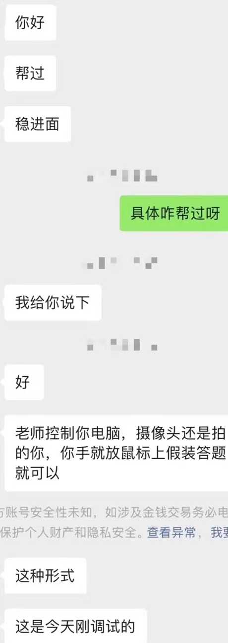 “老師(遠(yuǎn)程)控制你的電腦,你手放在鼠標(biāo)上假裝答題就可以?!?/p>
