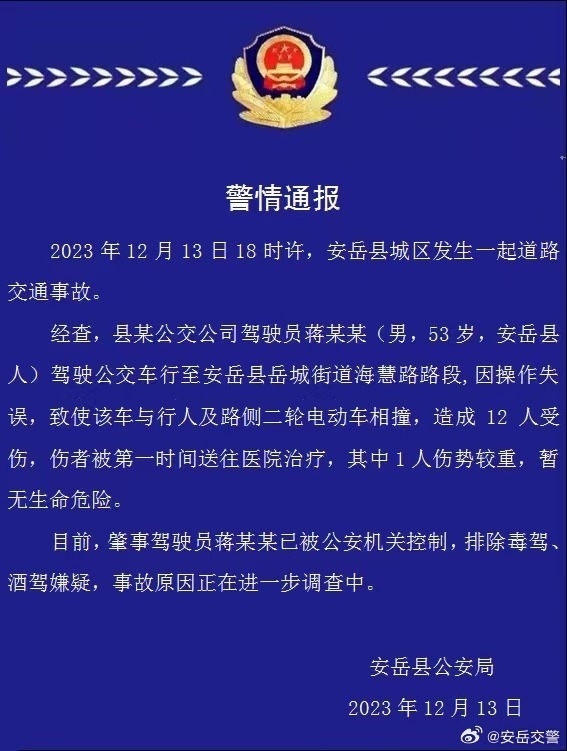 ·四川安岳一公交車中學門口撞倒多名學生,警方通報:12人受傷。