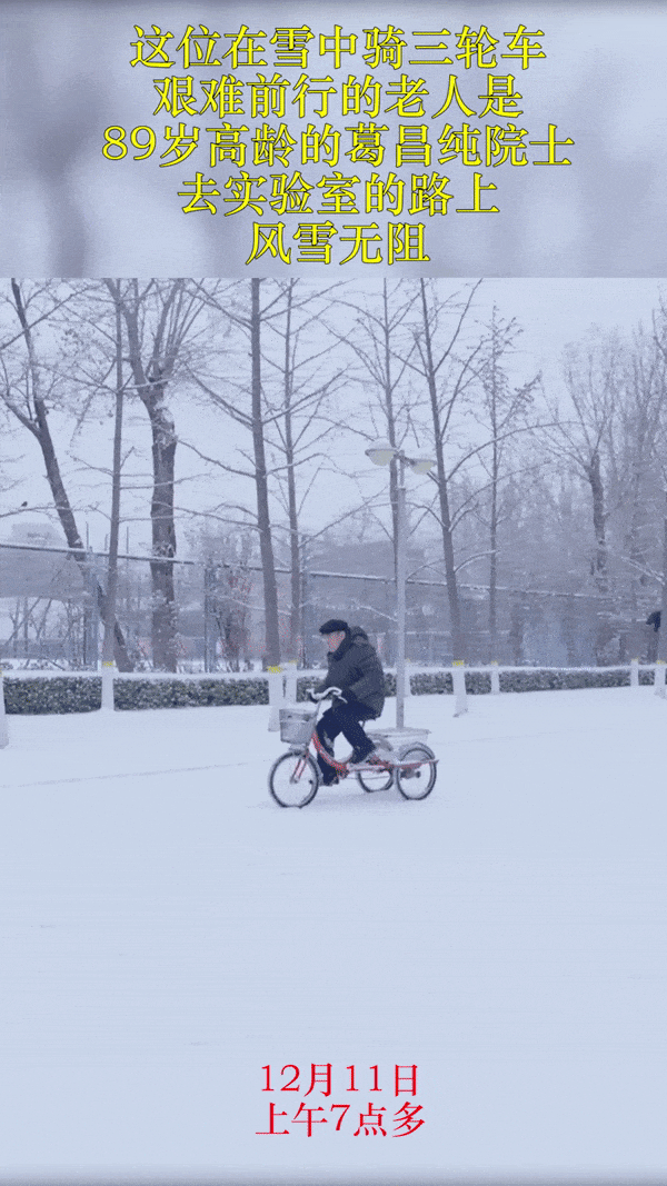 近日,早上7點多,北京降雪后,在北京科技大學的校園內(nèi),拍到感人一幕。茫茫白雪中,一位老人吃力地蹬著三輪車緩緩地前進,風雪無阻。老人是89歲的葛昌純院士,這天早晨,他正騎車前往實驗室,而騎著三輪車去實驗室,是葛老幾十年如一日的堅持。葛昌純院士是著名核材料、粉末冶金以及先進陶瓷專家,是我國“核工業(yè)功勛”人物,為“兩彈一星”事業(yè)作出了重要貢獻。