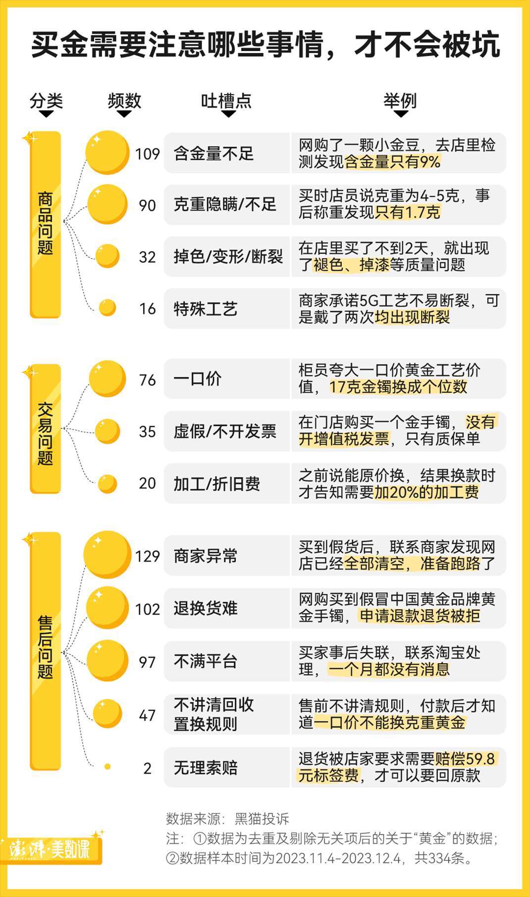 通過(guò)梳理黑貓投訴2023年所有關(guān)于“黃金”的消費(fèi)糾紛,澎湃新聞發(fā)現(xiàn)無(wú)論是在網(wǎng)購(gòu)還是線下,品牌店還是非品牌店,購(gòu)買(mǎi)黃金都有可能踩坑。