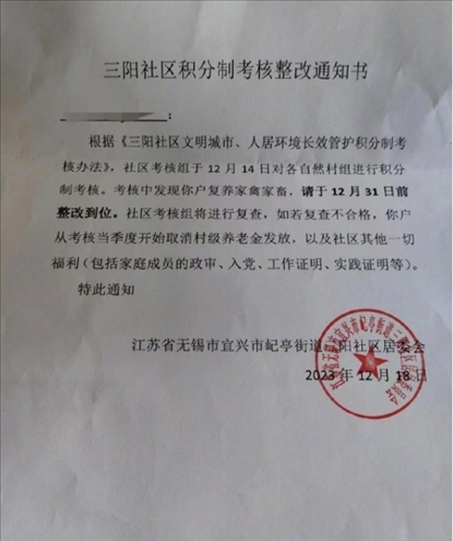 ·江蘇宜興一社區(qū)禁止養(yǎng)家禽,不整改將取消村級(jí)養(yǎng)老金、工作證明、入黨等福利,官方回應(yīng):撤銷(xiāo)通知書(shū)、廢止考核,調(diào)查處理責(zé)任人。