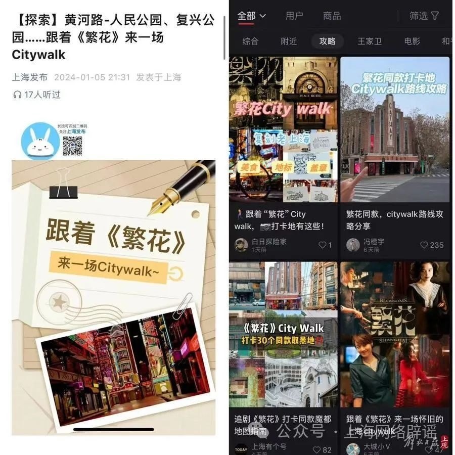 為此,上海辟謠平臺(tái)以“上海Citywalk”“繁花Citywalk”等為關(guān)鍵詞,搜索了多家旅游服務(wù)在線平臺(tái)、社交平臺(tái),都沒(méi)有發(fā)現(xiàn)主播們引用的“3公里Citywalk收費(fèi)520元”圖片,也沒(méi)有看到與“繁花Citywalk”相關(guān)的收費(fèi)服務(wù)。