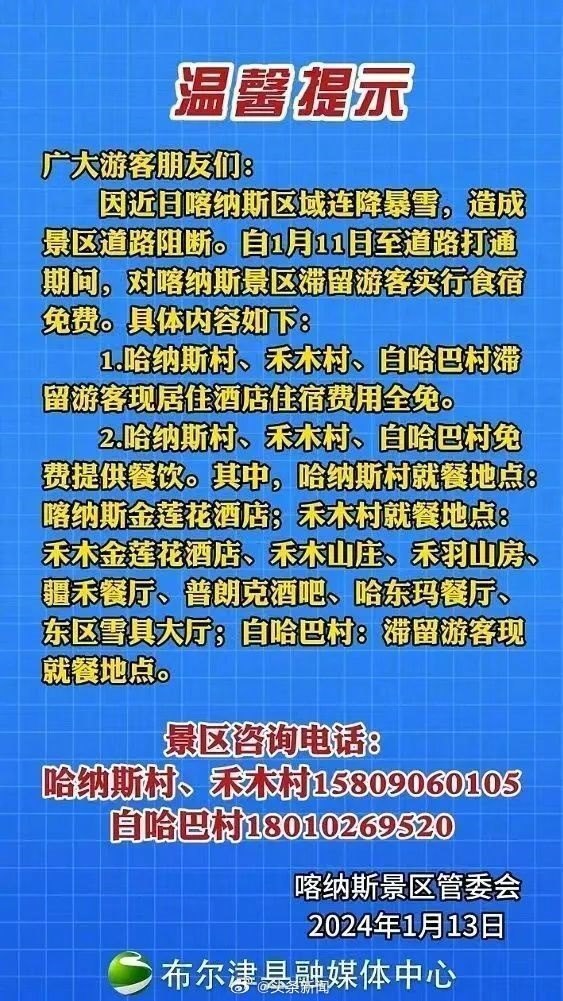 1月13日,喀納斯景區(qū)發(fā)布公告稱,對滯留游客實行食宿免費 來源網(wǎng)絡