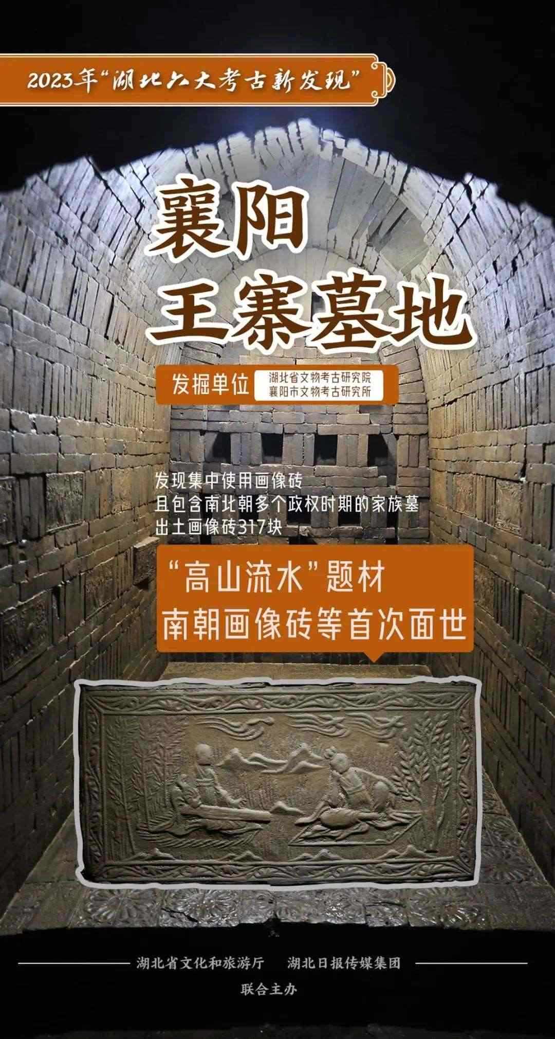 襄陽王寨墓地,發(fā)現(xiàn)一處集中使用畫像磚且年代跨越南、北朝多個政權(quán)時期的家族墓,其中7座墓葬出土畫像磚共計317塊,涉及19種不同圖案。首次發(fā)現(xiàn)“高山流水”題材以及“五音直郎”“小輿大駕行”“牽誕馬”榜題的畫像磚。