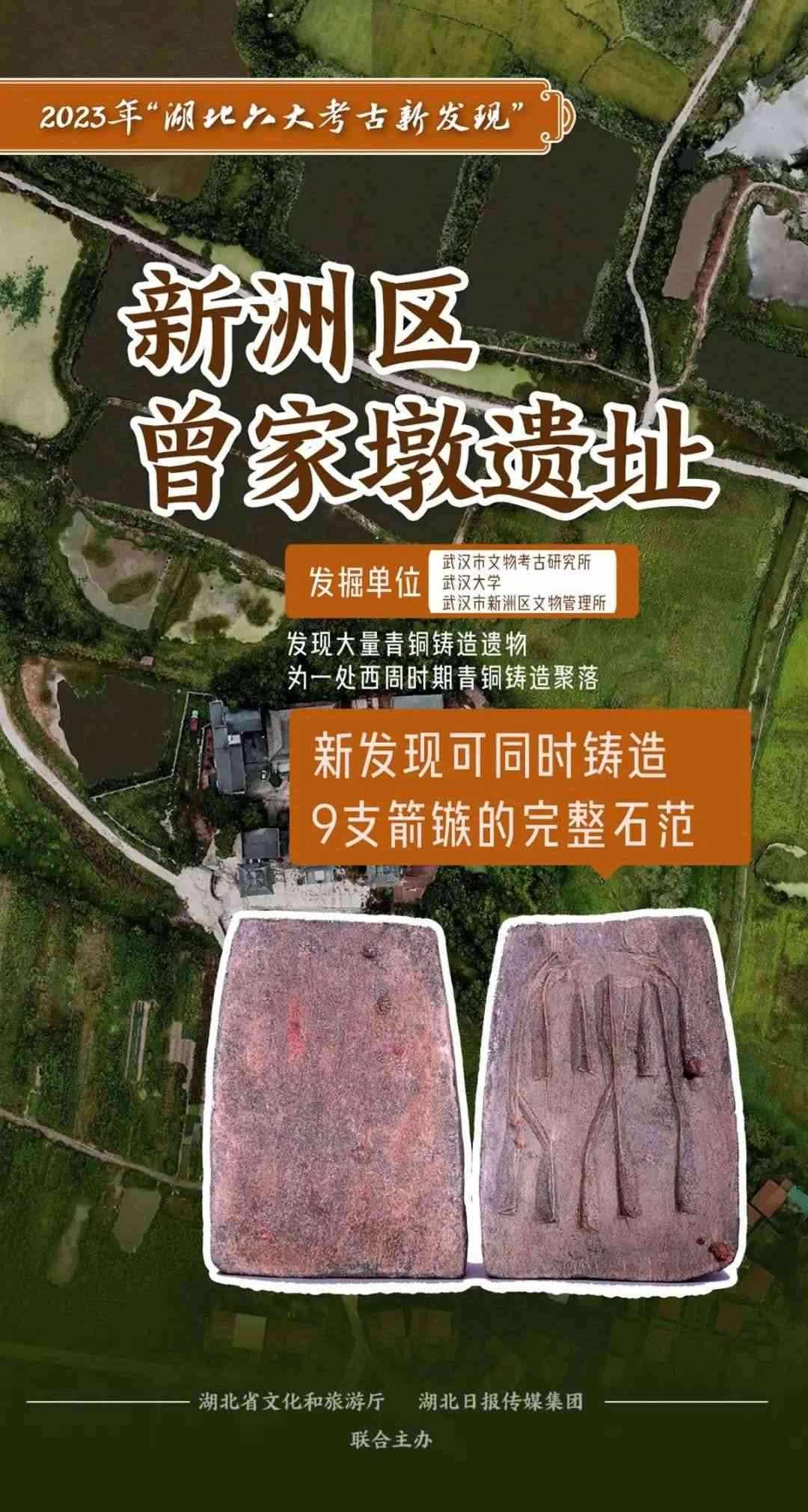 繼武漢黃陂盤龍城遺址小嘴遺址點、郭元咀遺址發(fā)現(xiàn)商代鑄銅遺存后,考古工作者在新洲曾家墩遺址新發(fā)現(xiàn)西周時期青銅鑄造遺存。遺址出土一塊用于鑄造青銅箭鏃的石范(即鑄造青銅器的石質(zhì)模具),保存完好,其完整程度在此前湖北地區(qū)考古中未曾發(fā)現(xiàn)。這塊石范可同時鑄造9支青銅箭鏃,具有相當(dāng)高的工藝水平。