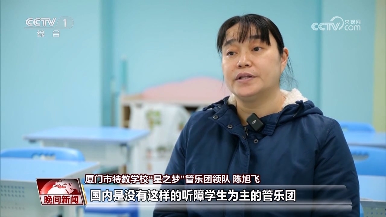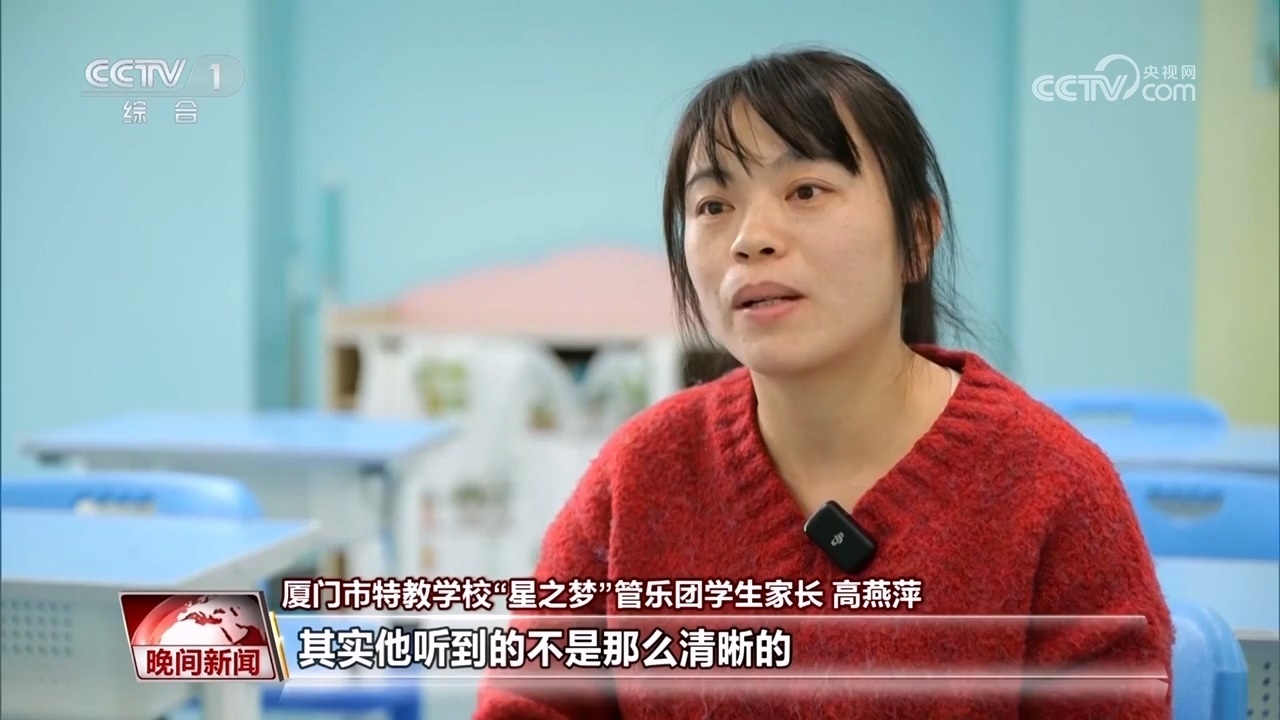 廈門市特教學(xué)?!靶侵畨?mèng)”管樂(lè)團(tuán)學(xué)生家長(zhǎng) 高燕萍:其實(shí)他聽(tīng)到的不是那么清晰的,但是他會(huì)覺(jué)得這個(gè)聲音很美,他用手語(yǔ)告訴我,他覺(jué)得很美。
