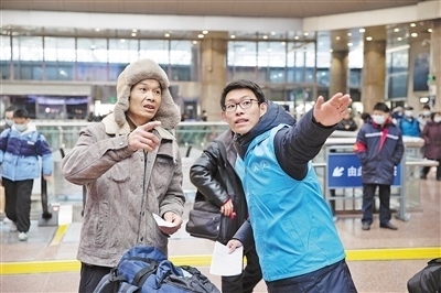 春運首日,北京西站內(nèi),中國鐵路北京局志愿者為旅客進行引導。本報記者 張武軍攝