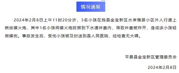·四川平昌通報“小孩放鞭炮炸飛多個井蓋”:1人輕微擦傷無大礙。