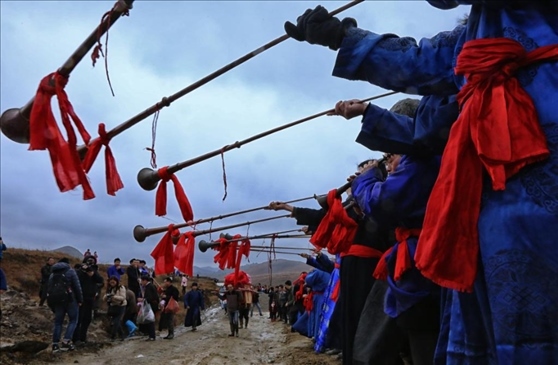 2016年春節(jié)前夕,貴州省惠水縣擺榜鄉(xiāng)石板村村民陳志良按照當?shù)鼗樗子怯涝?,新郎接親隊伍長鳴長號迎娶新娘。