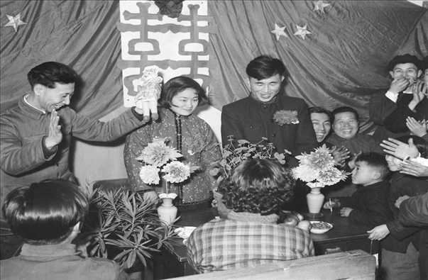 1957年春節(jié),遼寧省沈陽風動工具廠的工人鞠復海(新郎)和俞鳳仙(新娘)在婚禮儀式上接受朋友們的祝賀。