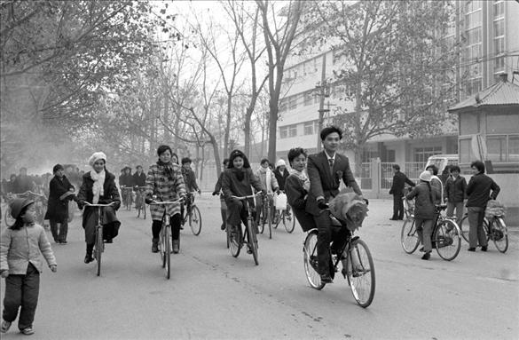 1990年春節(jié)期間,在陜西西安閻良區(qū),胸掛紅花的新郎用自行車馱著新娘經(jīng)過街頭。那個年代,用自行車接新娘曾經(jīng)一度成為流行的結婚方式。