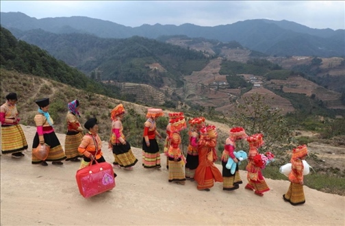 2017年2月21日,在四川省涼山彝族自治州德昌縣南山傈僳族鄉(xiāng)小南山村,新娘張小芳(右四)和送親隊伍帶著嫁妝向男方家走去。每年春節(jié)前后(農歷臘月至次年二月)是當?shù)乩圩迦伺e行婚禮的季節(jié)。