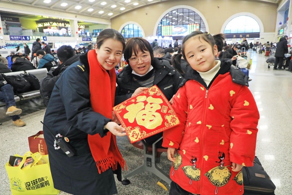 湖北武漢漢口火車站工作人員為候車旅客送“?!弊郑?月2日攝)。新華社發(fā)(邱晟 攝)