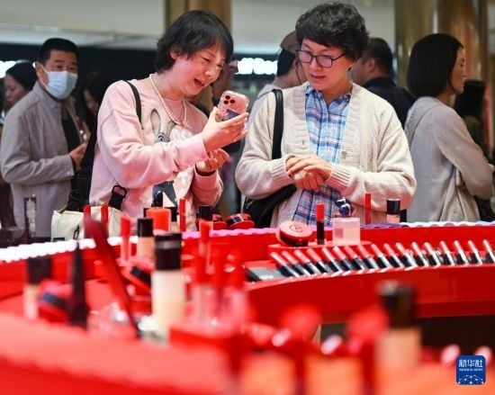 消費(fèi)者在??趪?guó)際免稅城選購(gòu)化妝品(2月11日攝)。