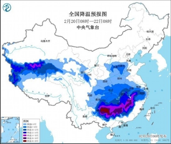 預(yù)計,2月20日8時至2月22日8時,華北南部、黃淮西部、江淮西部、江漢、江南中北部、貴州東部、廣西北部等地的部分地區(qū)將先后降溫8~10℃,其中,江漢、江南中西部、貴州東部等地將降溫12℃~14℃,湖南南部、江西南部、貴州東部、廣西北部等地的部分地區(qū)降溫可達(dá)16℃以上。