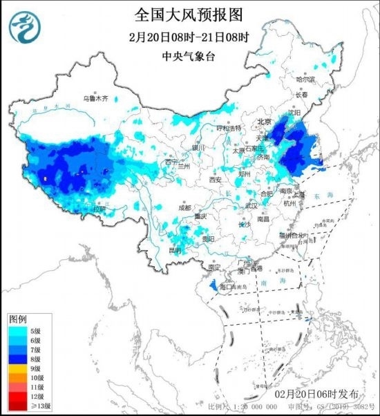 中央氣象臺2月20日6時繼續(xù)發(fā)布大風(fēng)藍(lán)色預(yù)警: