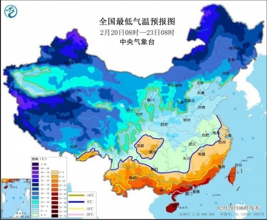 中新網(wǎng)2月20日電 據(jù)中央氣象臺網(wǎng)站消息,中央氣象臺2月20日6時繼續(xù)發(fā)布寒潮橙色預(yù)警:受寒潮影響,預(yù)計,2月20日至2月23日,我國中東部大部將自北向南先后出現(xiàn)降溫,日平均或最低氣溫普遍下降8~12℃,華北南部、黃淮西部、江淮、江漢、江南、華南中北部及貴州等地氣溫將下降12~18℃,其中,湖南南部、貴州東部、廣西北部等地的部分地區(qū)累計降溫幅度可達(dá)20℃以上。2月23日前后,最低溫度0℃線將南壓到蘇皖南部至湖南南部、貴州南部一帶。