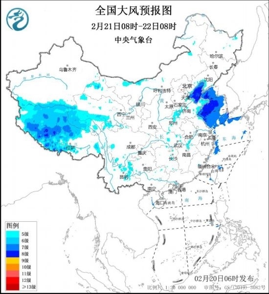 2月21日8時至22日8時,西藏中西部、青海中南部、華北東部、黃淮西部和東部、江淮西部等地的部分地區(qū)有5~6級風(fēng),陣風(fēng)7~8級。渤海、渤海海峽、黃海大部海域?qū)⒂?~8級,陣風(fēng)9~10級的大風(fēng)。