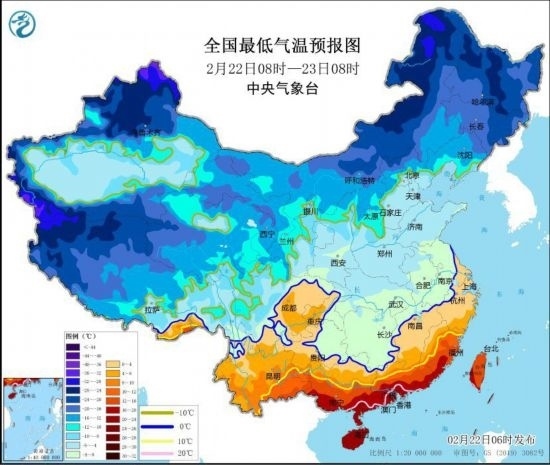 全國(guó)最低氣溫預(yù)報(bào)圖(2月22日8時(shí)-23日8時(shí))