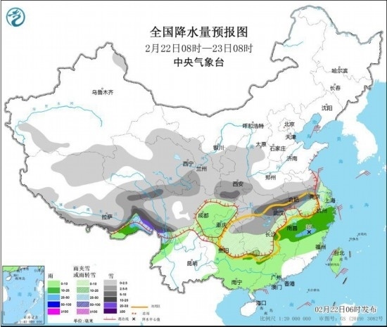 預(yù)計(jì),2月22日8時(shí)至23日8時(shí),陜西南部、安徽中部、湖北中東部、四川盆地東北部以及西藏東部、青海南部、云南西北部等地部分地區(qū)有大雪,其中,西藏東南部、湖北東部等地部分地區(qū)有暴雪(10~15毫米)。上述部分地區(qū)新增積雪深度3~6厘米,局地可達(dá)8~10厘米;安徽中南部、江蘇西南部、浙江西北部、湖北中東部和南部、湖南大部、江西西北部、貴州東部、重慶東南部等地的部分地區(qū)有凍雨或冰粒,凍雨量1~5毫米,局地10毫米以上。中央氣象臺(tái)2月22日6時(shí)繼續(xù)發(fā)布暴雪黃色預(yù)警和冰凍黃色預(yù)警。廣西東北部、湖南南部、江西中北部、浙江、福建西北部、廣東中西部和西南部沿海等地的部分地區(qū)有中到大雨,局地伴有雷暴。