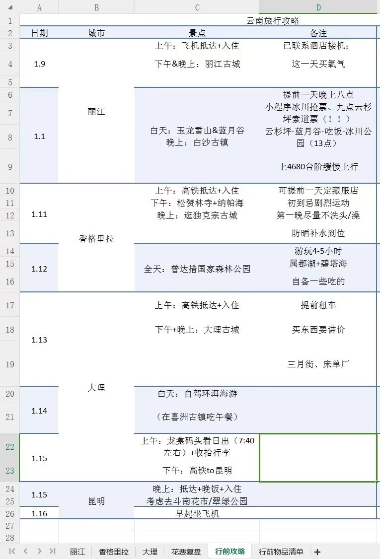 這個(gè)冬天去云南旅行前,周玫將自己的計(jì)劃制成一張excel表格,具體到每個(gè)市、每個(gè)景點(diǎn)、每種美食……旅行結(jié)束后,她還對云南游的具體執(zhí)行情況進(jìn)行了復(fù)盤總結(jié),在社交平臺(tái)上分享給她的“電子驢友”。