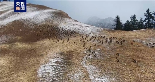 近日,甘肅祁連山國家級自然保護區(qū)寺大隆自然保護站管護人員利用無人機巡護時,拍攝到一大群巖羊在雪地覓食、追逐,據(jù)管護人員目測達200多只。