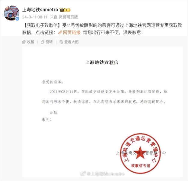 上海地鐵11號線因車輛故障限速運行預(yù)計晚點15分鐘以上,官方致歉