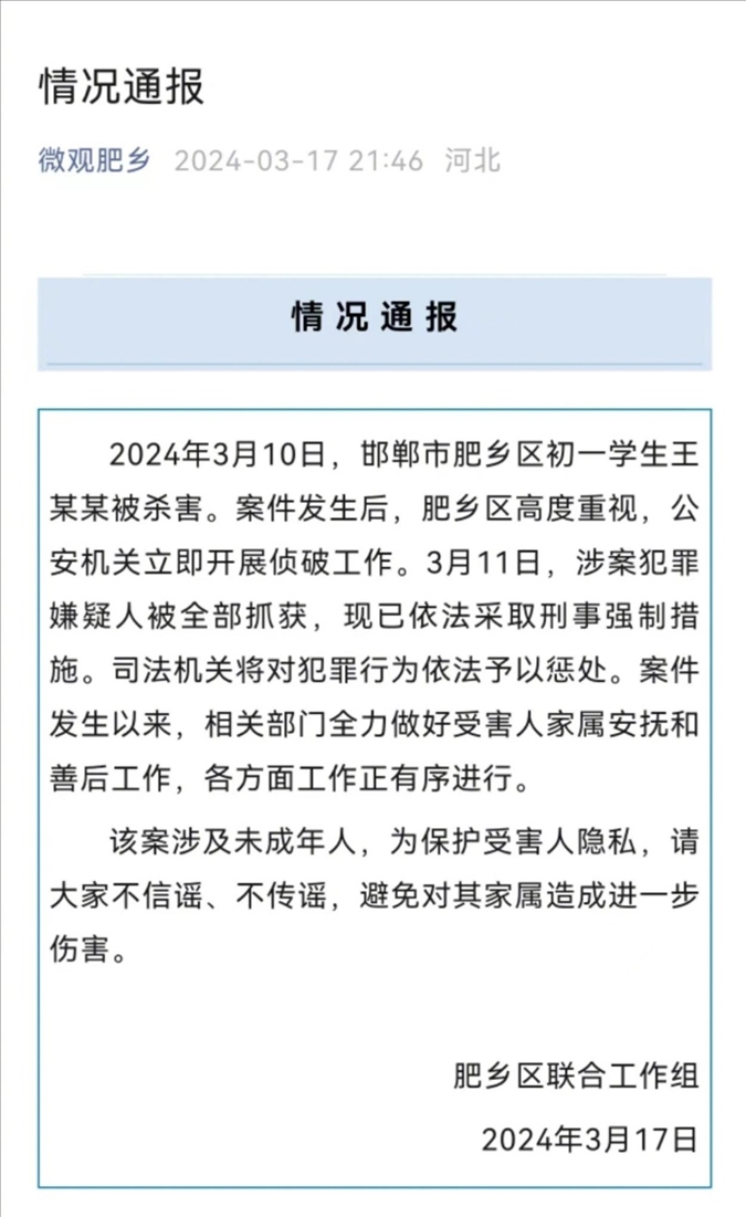 ·河北邯鄲通報(bào)初中生被殺害案:嫌疑人全部抓獲。