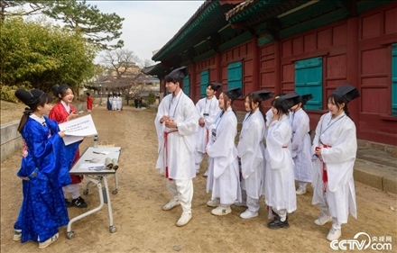 當(dāng)?shù)貢r(shí)間2024年3月16日,韓國(guó)首爾,成均館大學(xué)的新生們穿著儒生服,參加一年一度的迎新禮。